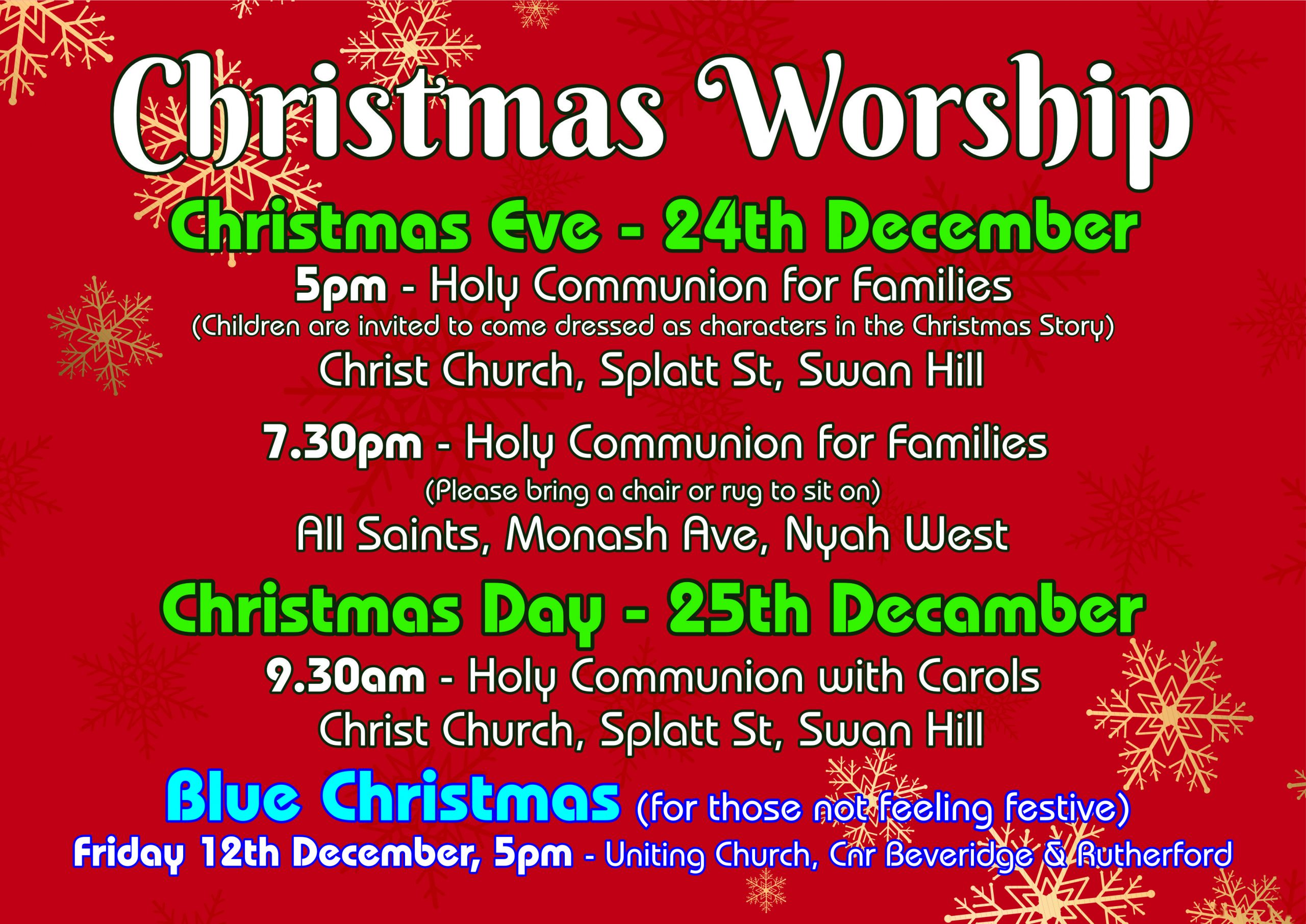 On Sunday 29 June we will be gathering for worship at Christ Church Swan Hill at 11.00am, followed by soup and sandwiches for lunch. BYO something sweet for dessert.